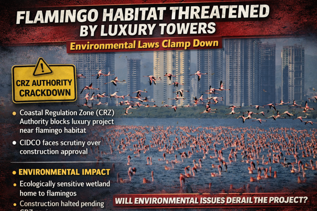 फ्लेमिंगो अभयारण्याच्या पर्यावरणीय संवेदनशीलतेला बाधा पोहोचवणाऱ्या पाम बीच मार्गावरील बहुचर्चित आलिशान गृहप्रकल्पावर अखेर पर्यावरणीय कायद्यांची कडक कारवाई झाली आहे. नेरूळ सेक्टर ६० येथील मिस्त्री कन्स्ट्रक्शनच्या या प्रकल्पाला सीआरझेड प्राधिकरणाने थेट मंजुरी नाकारत तो प्रलंबित ठेवल्याने पर्यावरणप्रेमी आणि कार्यकर्त्यांच्या संघर्षाला मोठे यश मिळाले आहे.